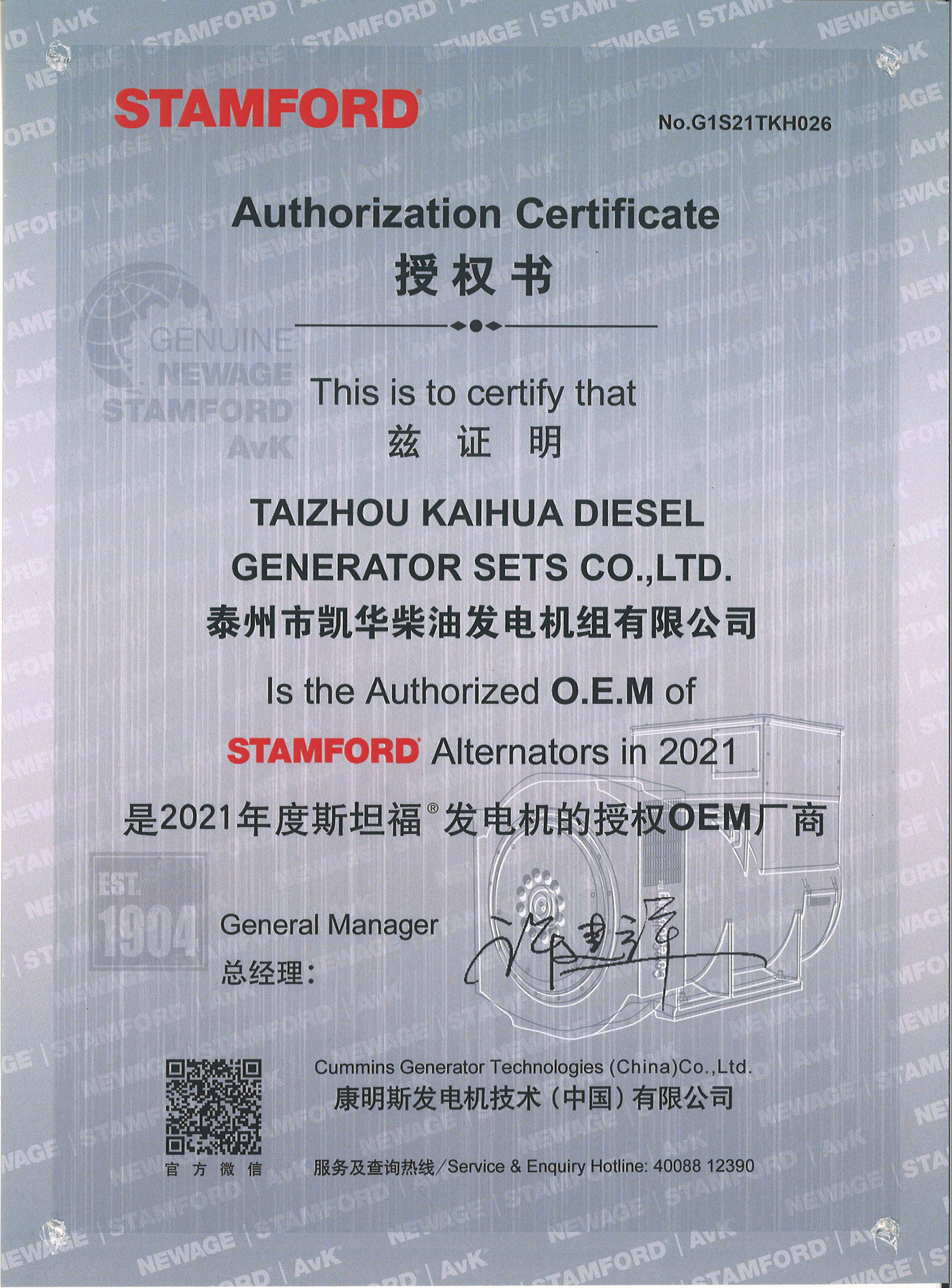 泰州市凱華柴油發電機組有限公司創建于2003年,是一家集柴油發電機組的研發、生產、銷售為一體的高新技術民營企業,公司目前注冊資本金11800萬元人民幣,生產基地占地六十畝,現有各類高素質員工一百多名,專業技術人員達46人,其中高級技術人員16人,年銷售額近6億元。公司主營產品:3~3000KW陸用柴油發電機組,15~600KW移動拖車電站,12~1000KW船用應急柴油發電機組,各種靜音型、中高壓、多機并聯、燃氣等特種機組以及進口系列柴油發電機組,可滿足不同客戶的不同電力需求,還可滿足用戶不同電壓、不同頻率的要求。